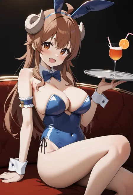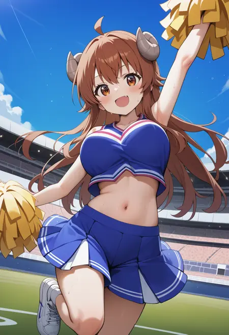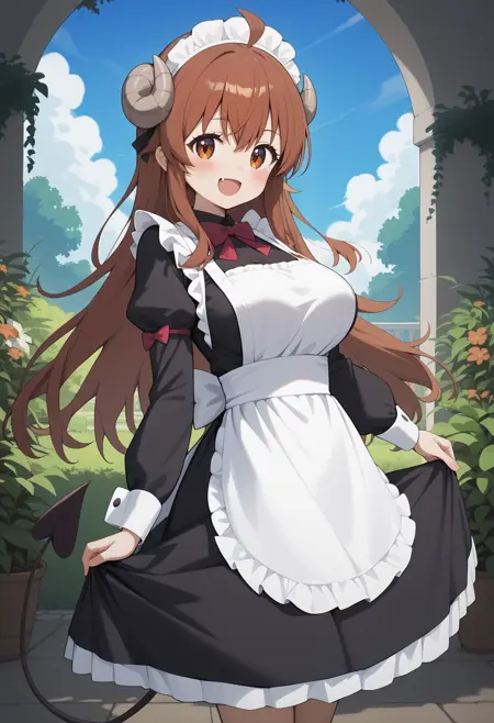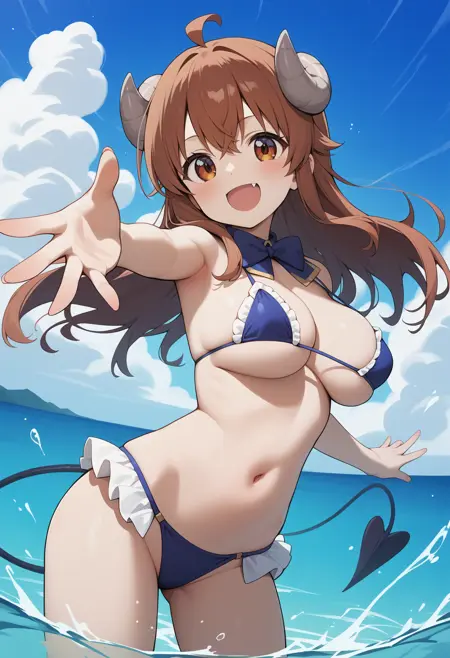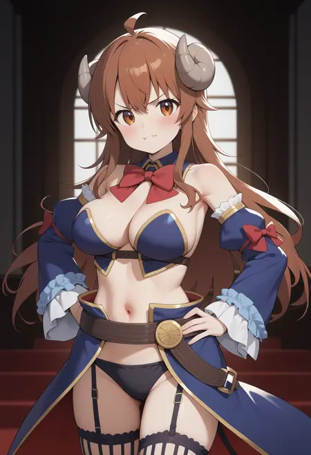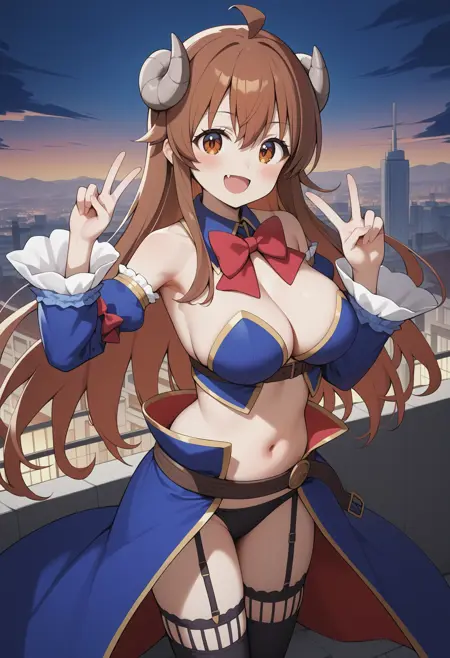 outfit1aayuuko, long hair, brown hair, ahoge, horns, brown eyes, fang, large breasts, detached collar, bare shoulders, revealing clothes, red bow, frills, crop top, detached sleeves, belt, black panties, blue skirt, garter straps, black thighhighs(+tail)