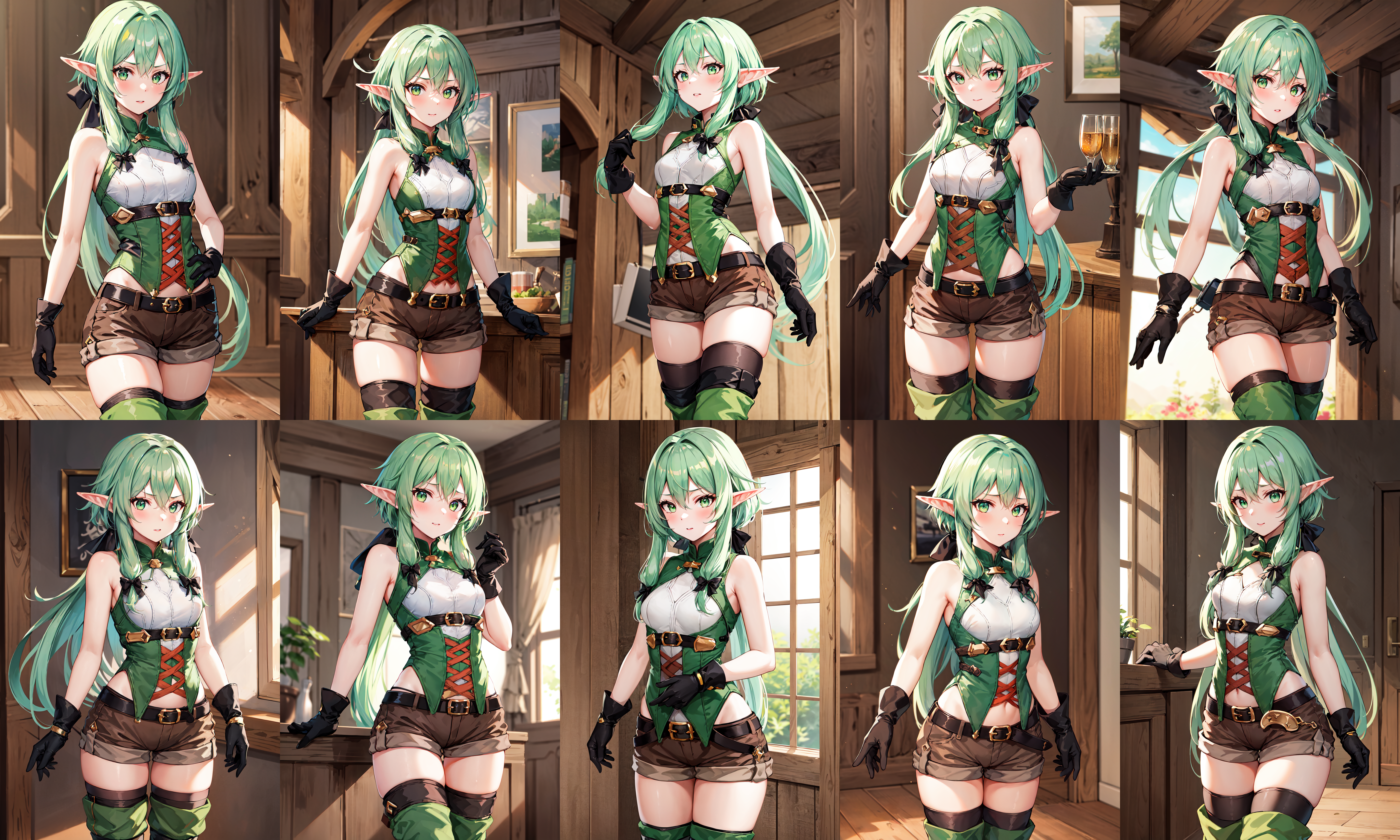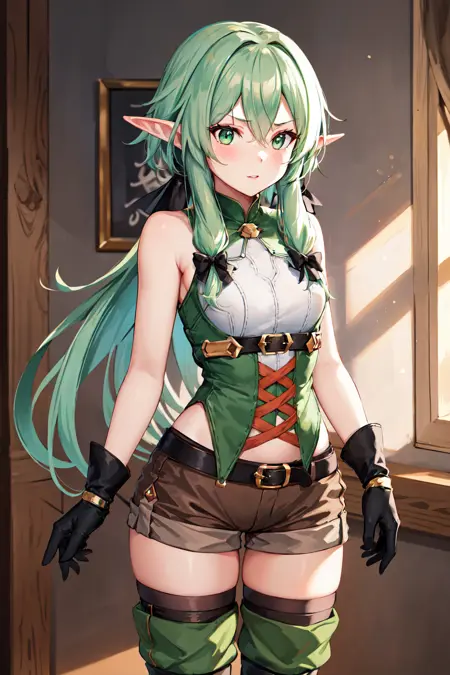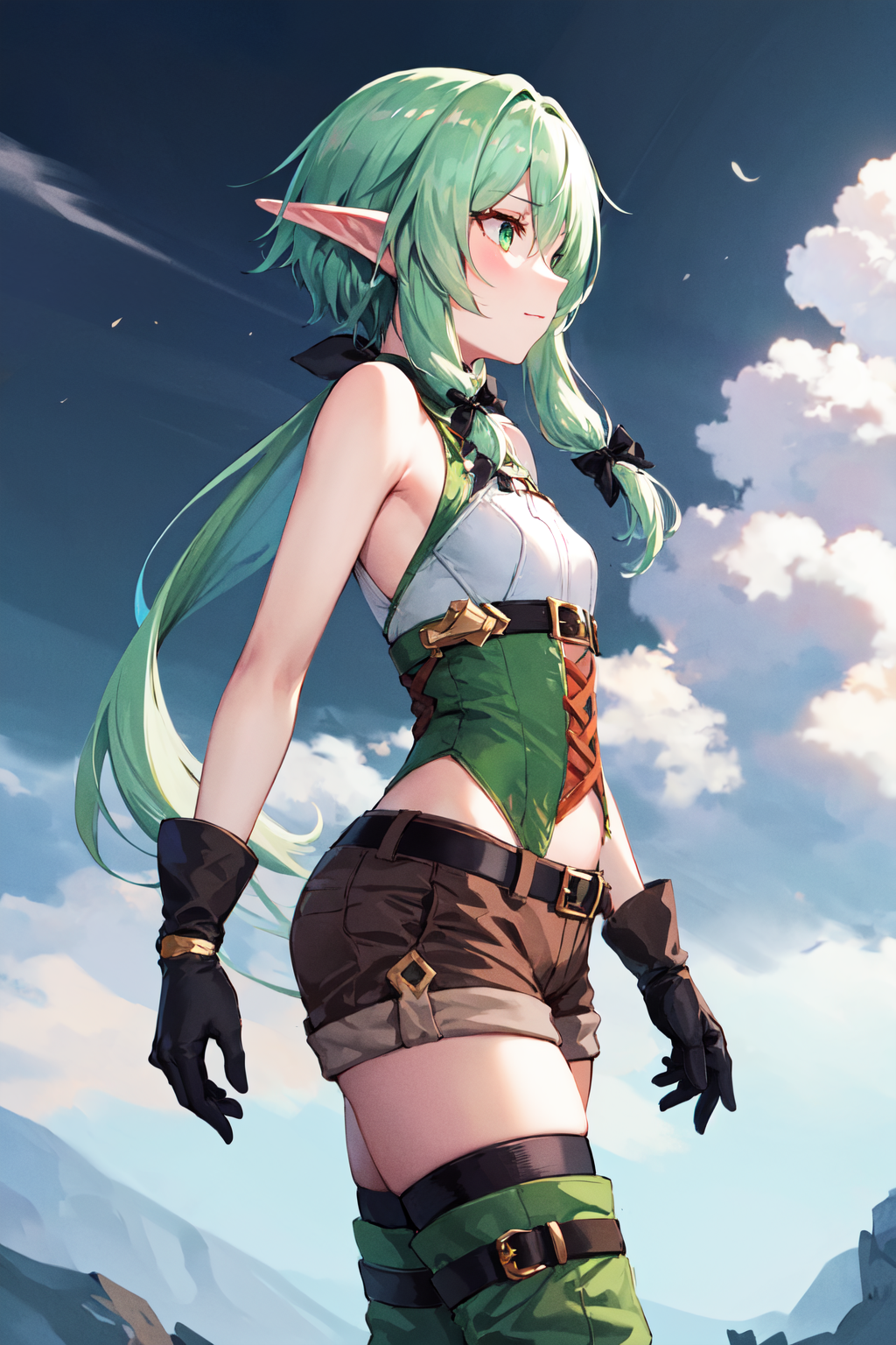 outfit2 (without cloak)1girl, elf, pointy ears, green hair, long hair, sidelocks, hair bow, green eyes, small breasts, sleeveless, black gloves, brown shorts, green thighhighs, short shorts, belt