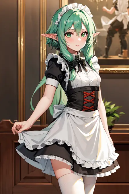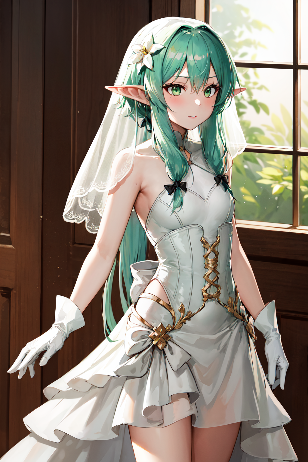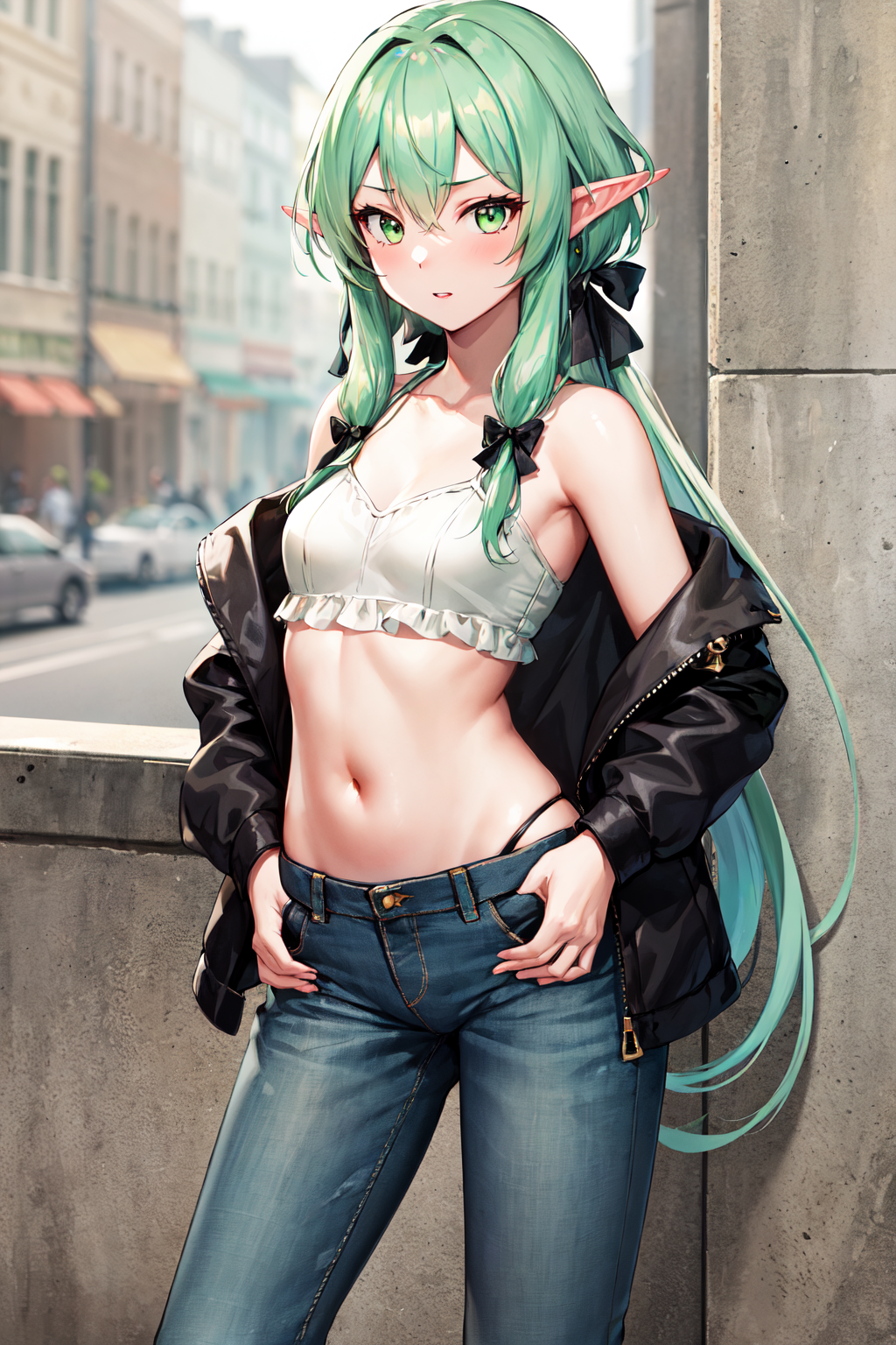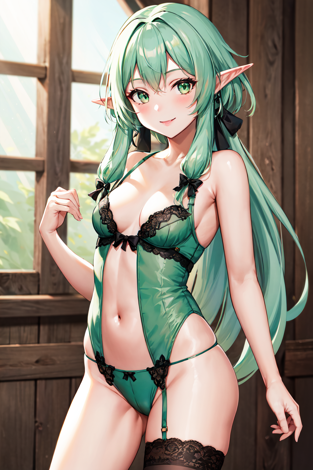 outfit2 (without cloak)1girl, elf, pointy ears, green hair, long hair, sidelocks, hair bow, green eyes, small breasts, sleeveless, black gloves, brown shorts, green thighhighs, short shorts, belt