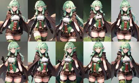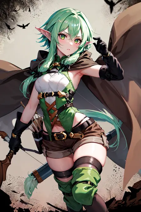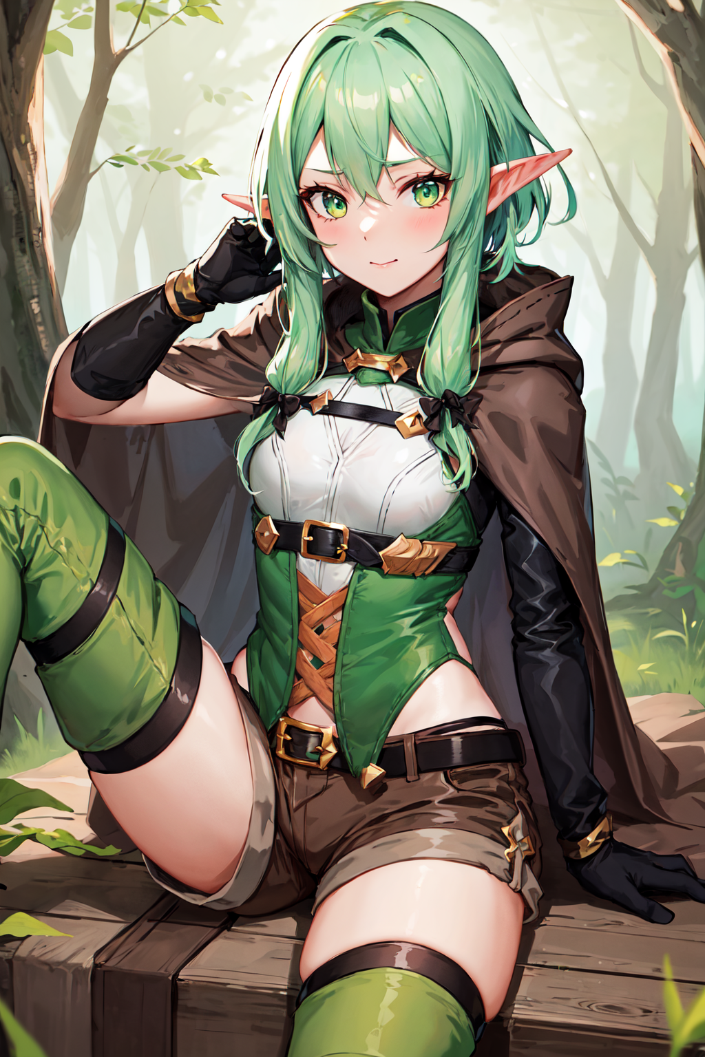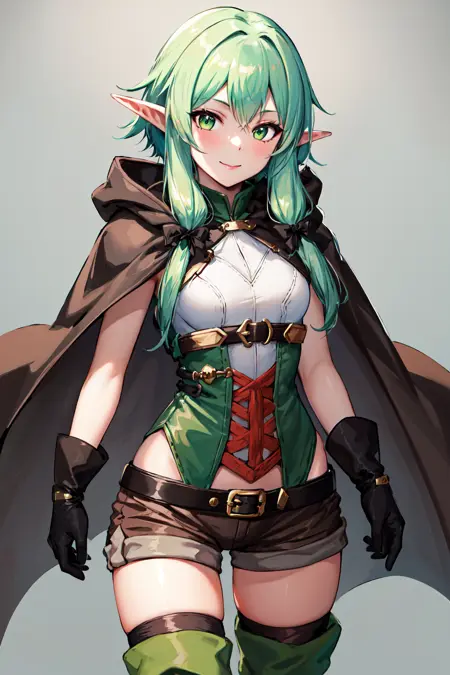 outfit1 (with cloak)1girl, elf, pointy ears, green hair, long hair, sidelocks, hair bow, green eyes, small breasts, cloak, black gloves, brown shorts, green thighhighs, short shorts, belt