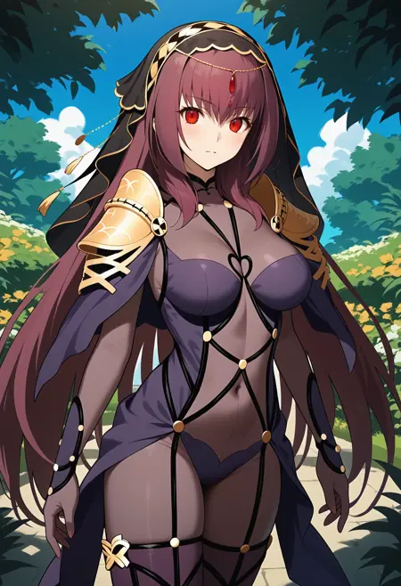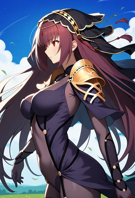 outfit2aascathach, long hair, purple hair, black veil, red eyes, large breasts, shoulder armor, gold armor, purple bodysuit, bodystocking