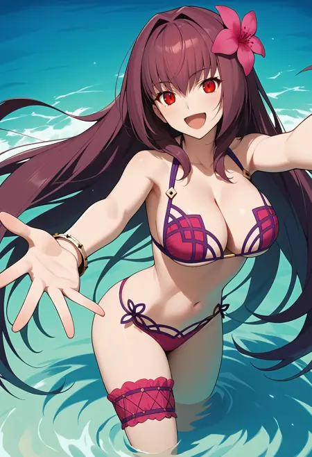 outfit3-2 (with sarong)aascathach, long hair, purple hair, hair flower, red eyes, large breasts, collarbone, cleavage, purple bikini, bracelet, sarong, bridal garter