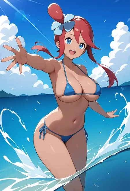 outfit1-1 (无衣物)aaskyla, red hair, one side up, hair ornament, sidelocks, dark-skinned female, blue eyes, large breasts, revealing clothes, cleavage, harness, blue gloves, stomach, highleg, thigh strap, thigh pouch