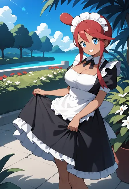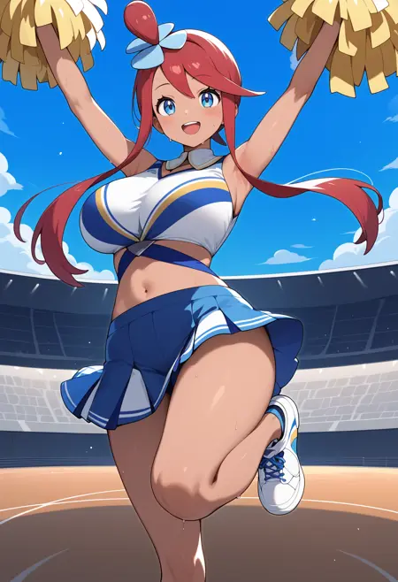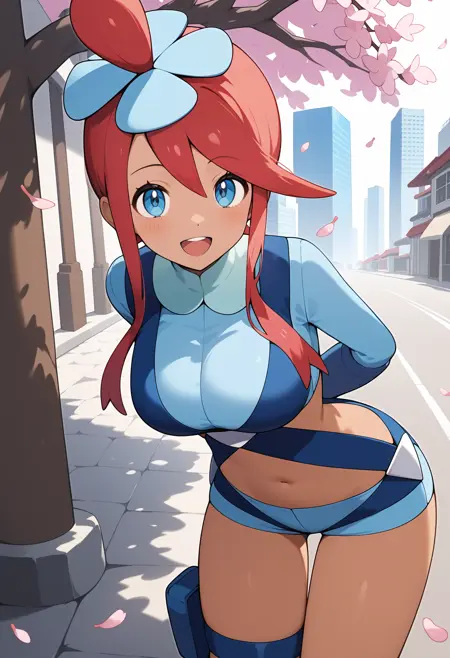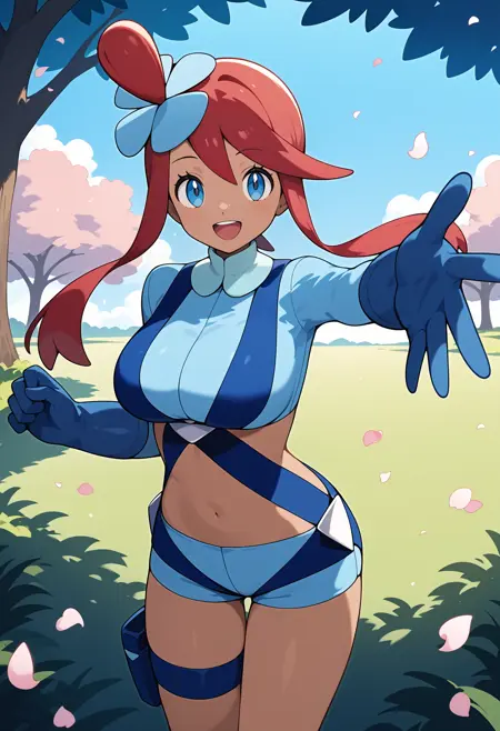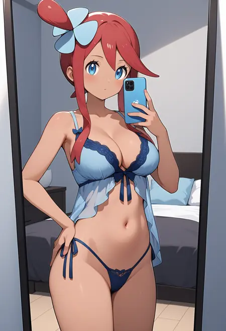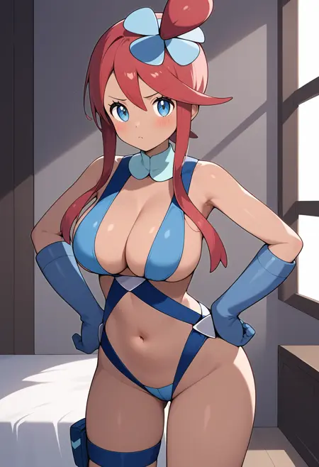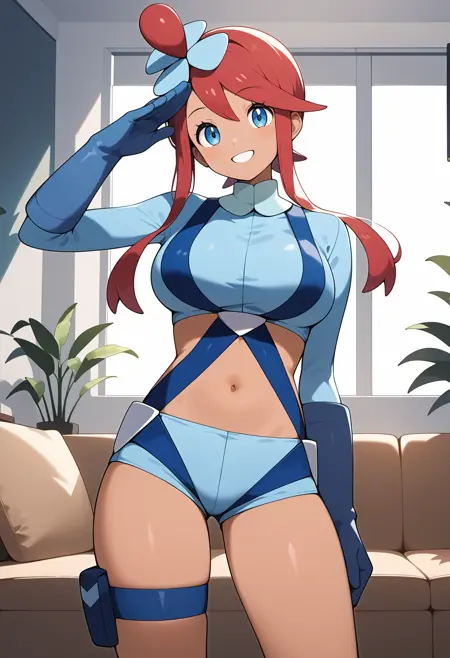 outfit1aaskyla, red hair, one side up, hair ornament, sidelocks, dark-skinned female, blue eyes, large breasts, harness, crop top, blue shirt, long sleeves, blue gloves, midriff, short shorts, blue shorts, thigh strap, thigh pouch