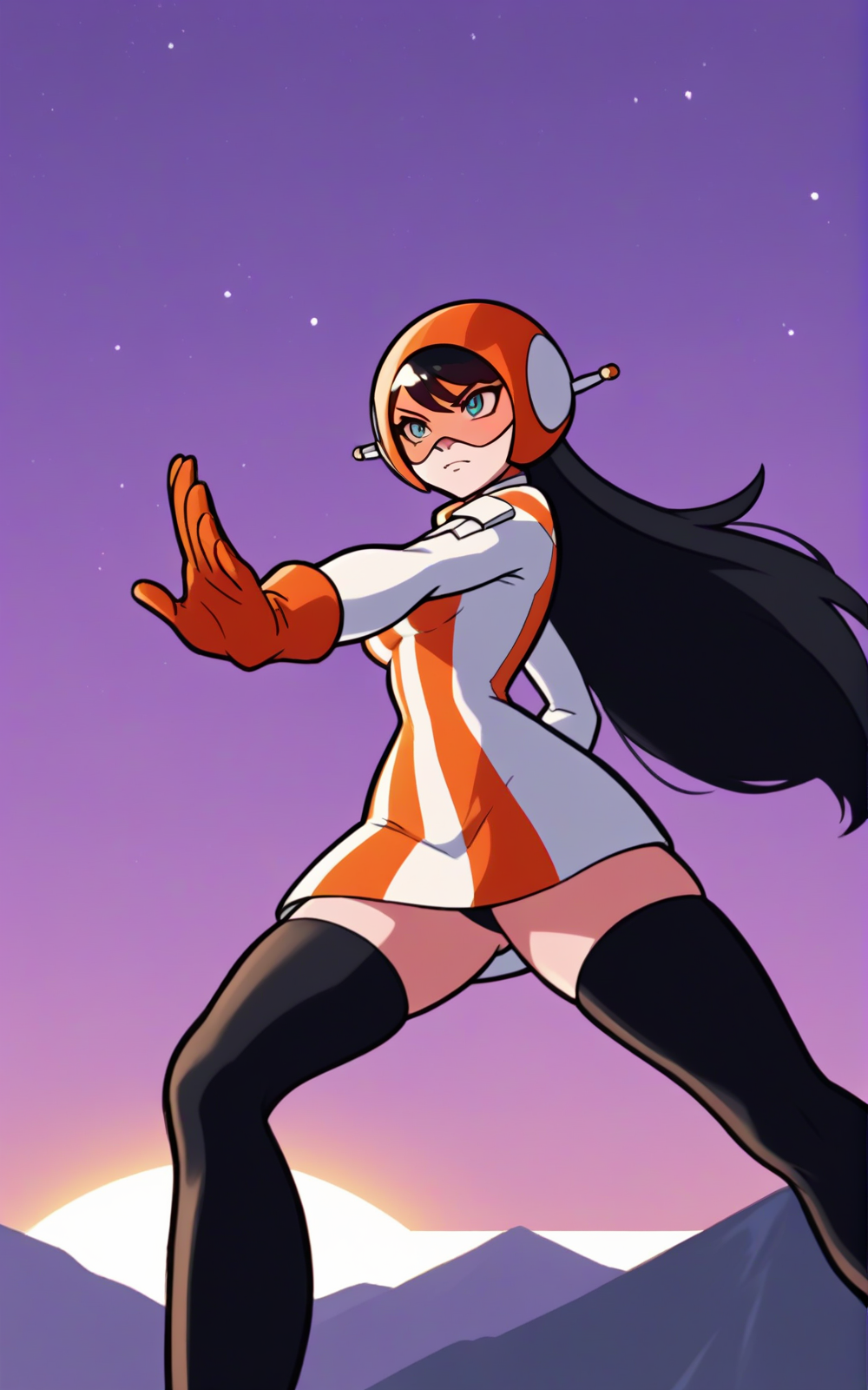 의상: 긴 소매, 장갑, 주황색 장갑, 다색 드레스, 바디수트, 드레스, 줄무늬 드레스, 짧은 드레스, 허벅지 길이 스타킹, 부츠, 검은 허벅지 길이 스타킹, 젯타이 리ょう이키, 허벅지 부츠, 헬멧, 검은 부츠, 주황색 시야판**