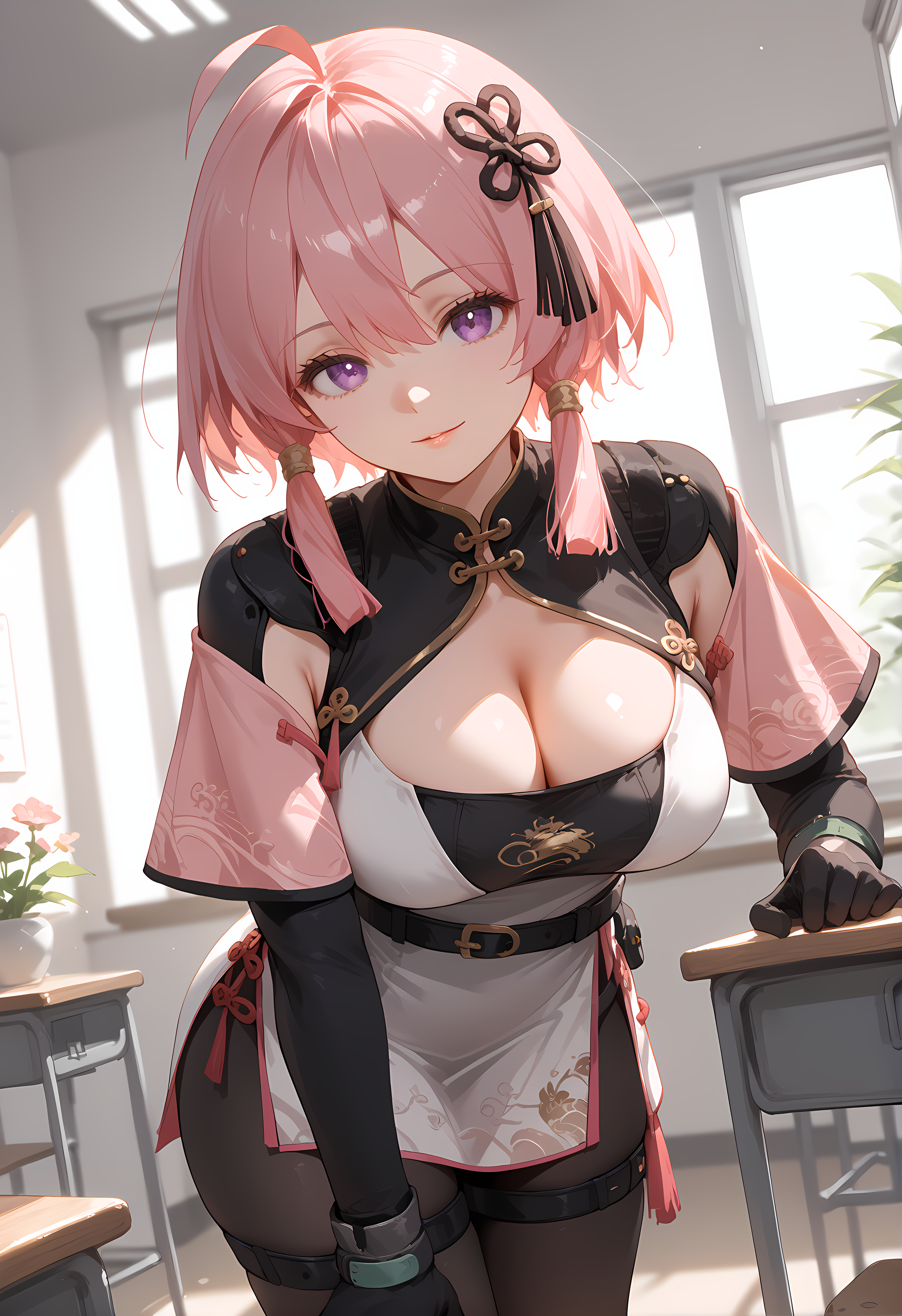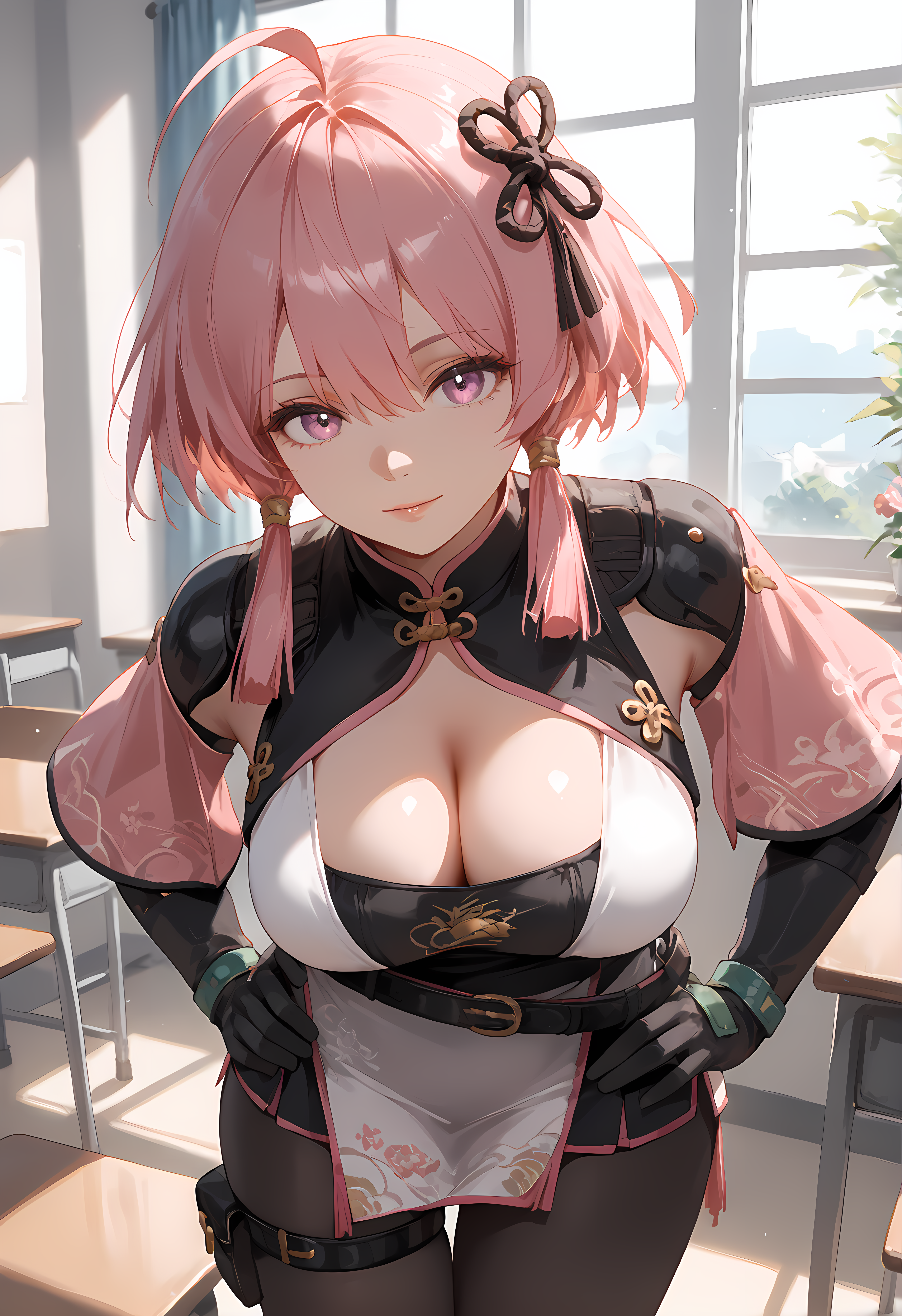 外見 → ohwx, 1girl, pink_hair, solo, breasts, large_breasts, hair_ornament, pink_eyes, purple_eyes, short_hair, ahoge, parted_lips, hair_ribbon, ribbon, medium_hair, long_hair, twintails, medium_breasts,