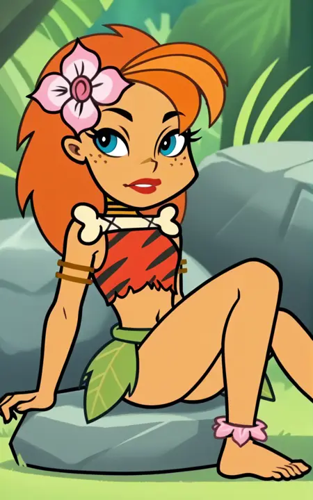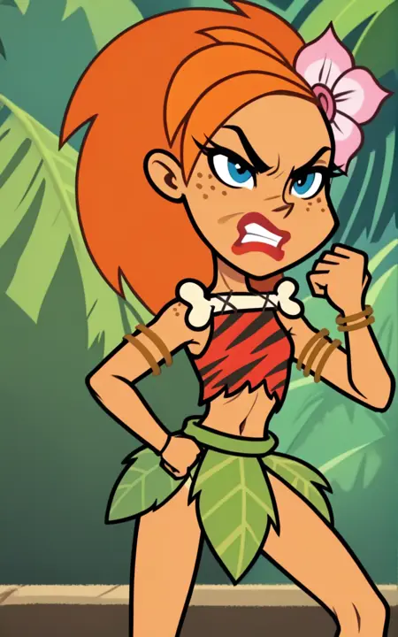她的服装: 红色上衣、虎纹、无袖、部落风、裙子、绿色裙子、臂环、动物纹、骨制装饰、发饰、肚脐、头发上的花、赤脚、脚链