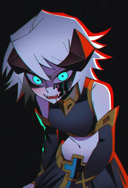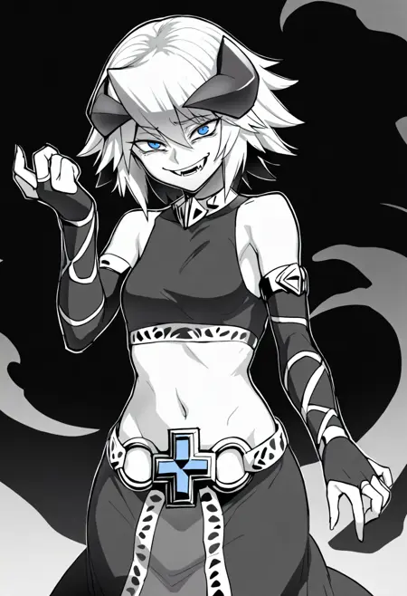 기본 프롬프트: 1girl, isoldeygo, white hair, short hair, blue eyes, horns, pointy ears, fangs, pale skin