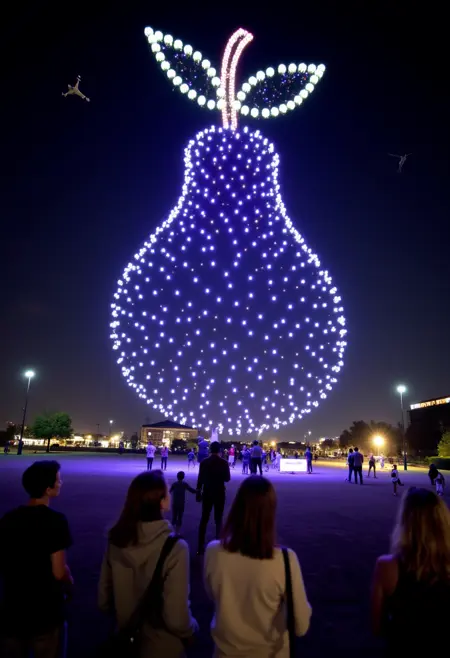 これは、都市のCITY NAMEのスカイラインの下で、ドローンの光がYOUR PROMPTという文字を巨大な空からのイルミネーションで形成する、夜空の写真です。