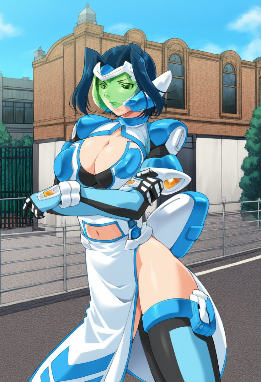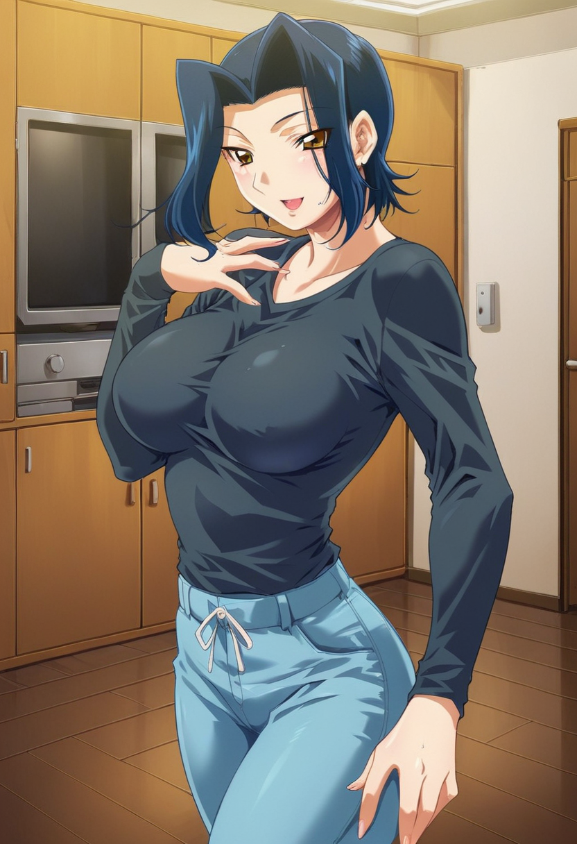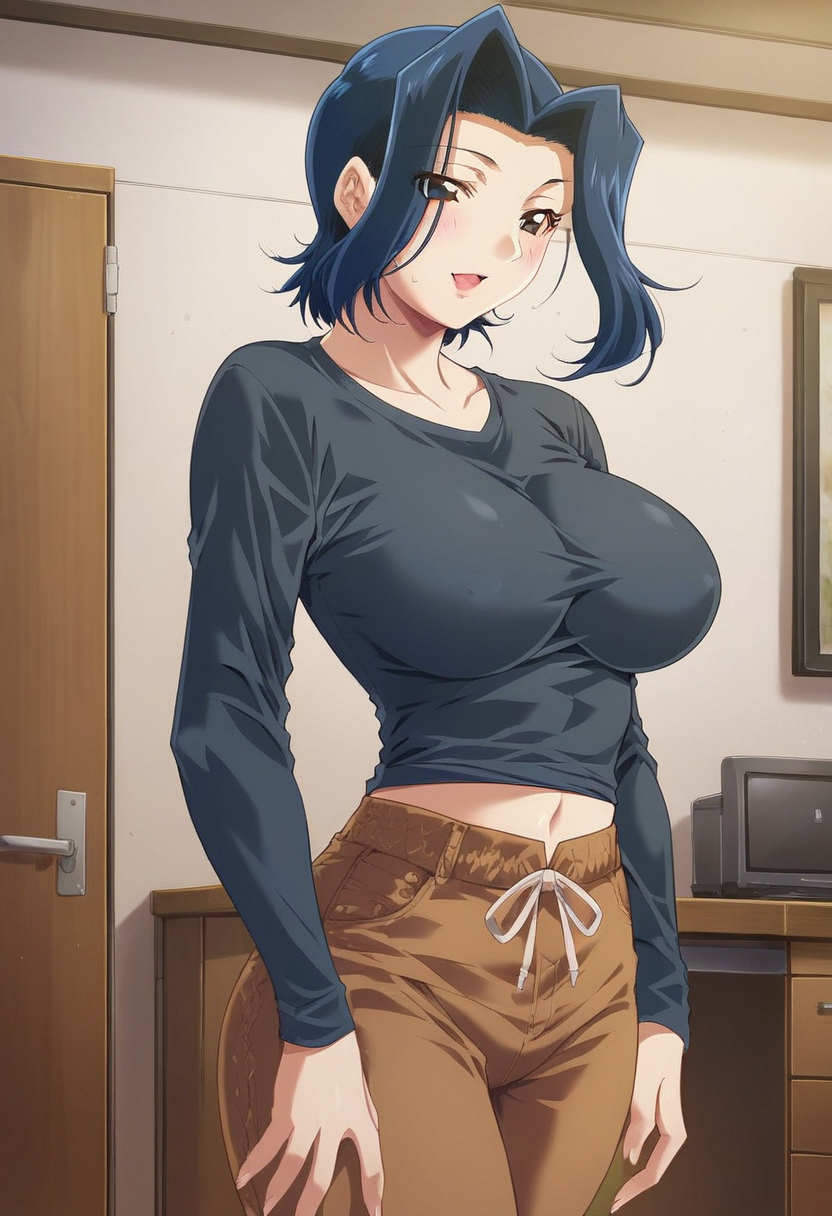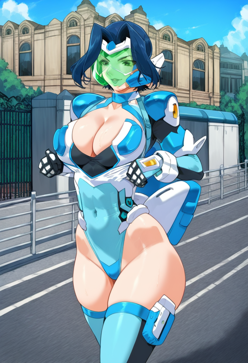 Trigger: hishiaiko, large breasts, blue hair female, short hair,