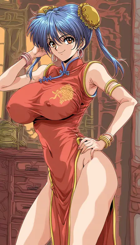 Chieko, jewelry, huge breasts, hair bun, blue hair, twintails, double bun, bracelet, earrings, orange eyes, armlet, twintails,