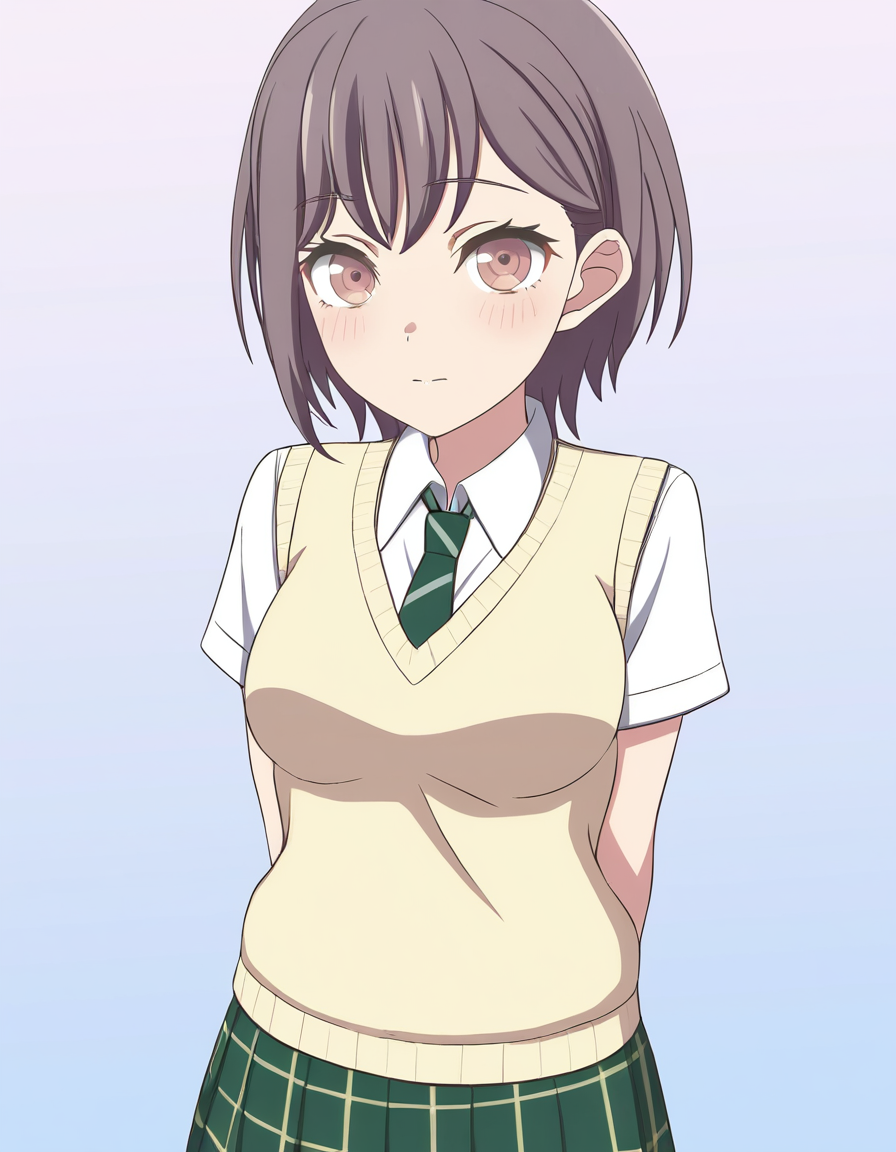 夏季制服:yellow sweater vest, green skirt, plaid skirt, pleated skirt, short sleeves, white collared shirt, green necktie, diagonal-striped necktie