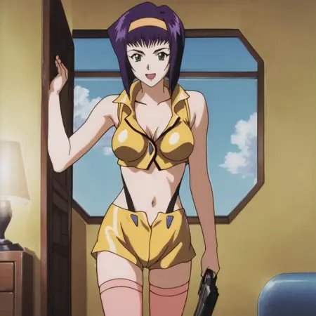 • 트리거: Faye, 1girl, solo, 보라색 머리, 녹색 눈, 허벅지 긴 양말, 노랑 반바지, 머리띠, 립스틱, 단발, 복부 노출, 레트로 아트 스타일, 메이크업, 카우보이 샷