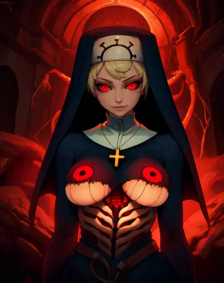 HORROR prompts may be stronger for XL versions. removal of nun, or adding horror \(theme\), may enhance effect