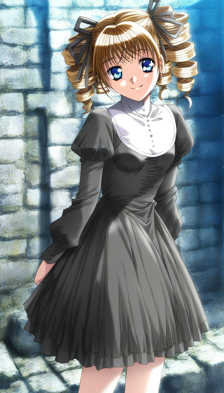 Yukiyanagi_Yuzu, drill hair, blue eyes, brown hair, blonde hair, hair ribbon, black ribbon, twin drills, small breasts,