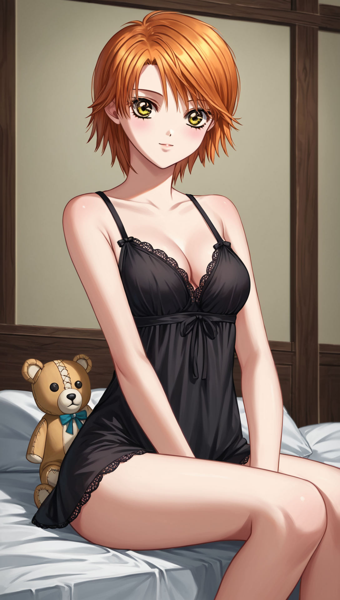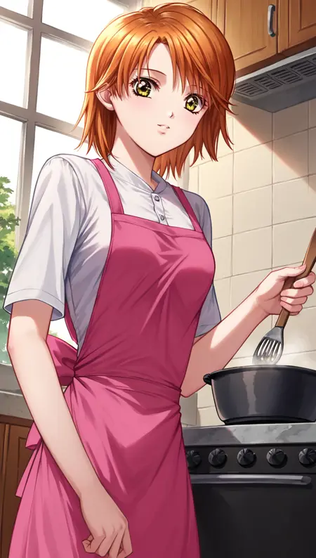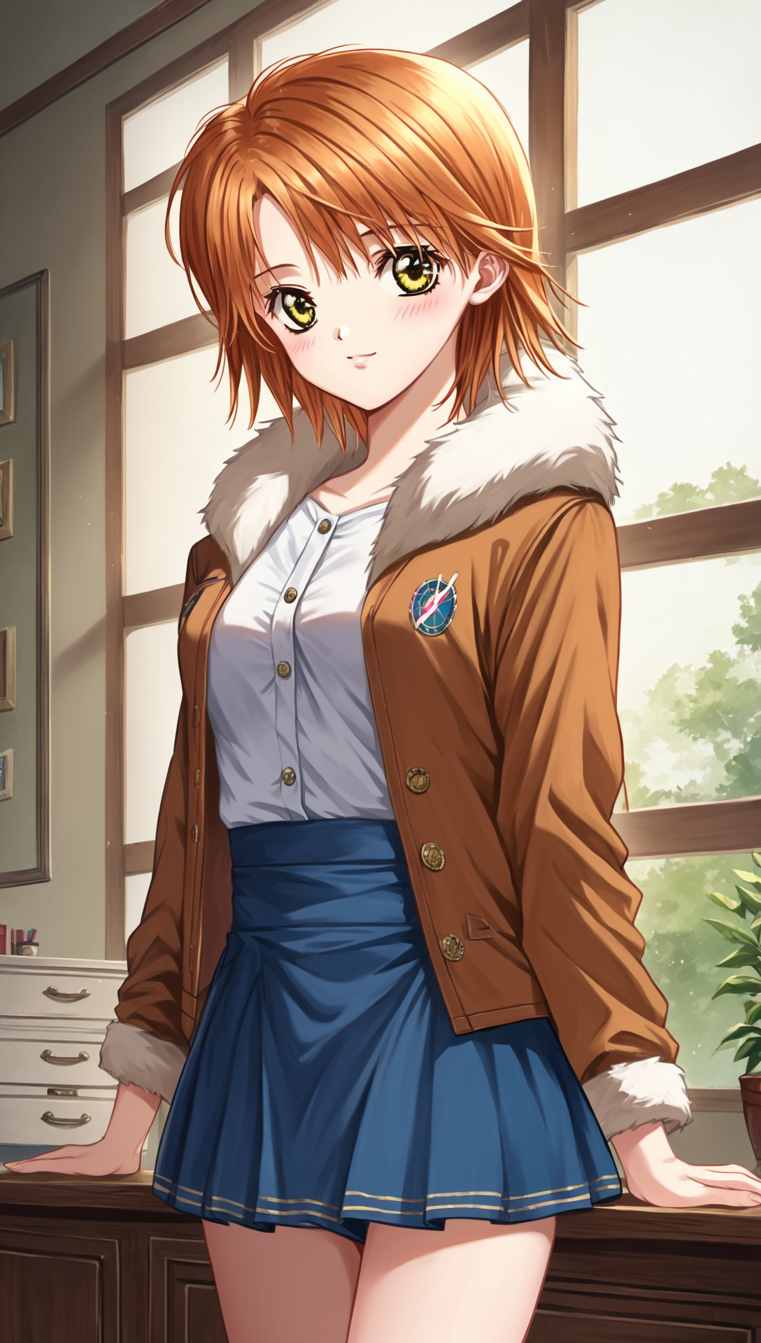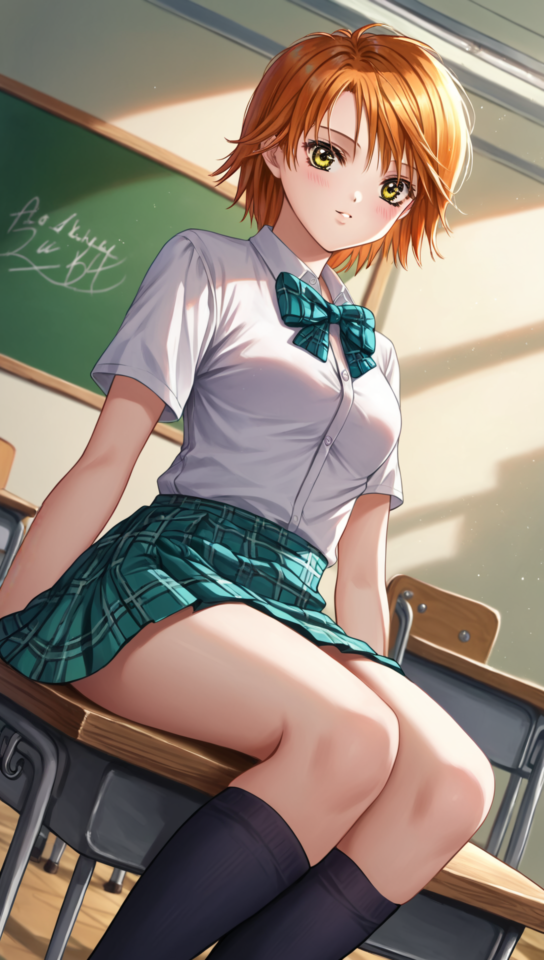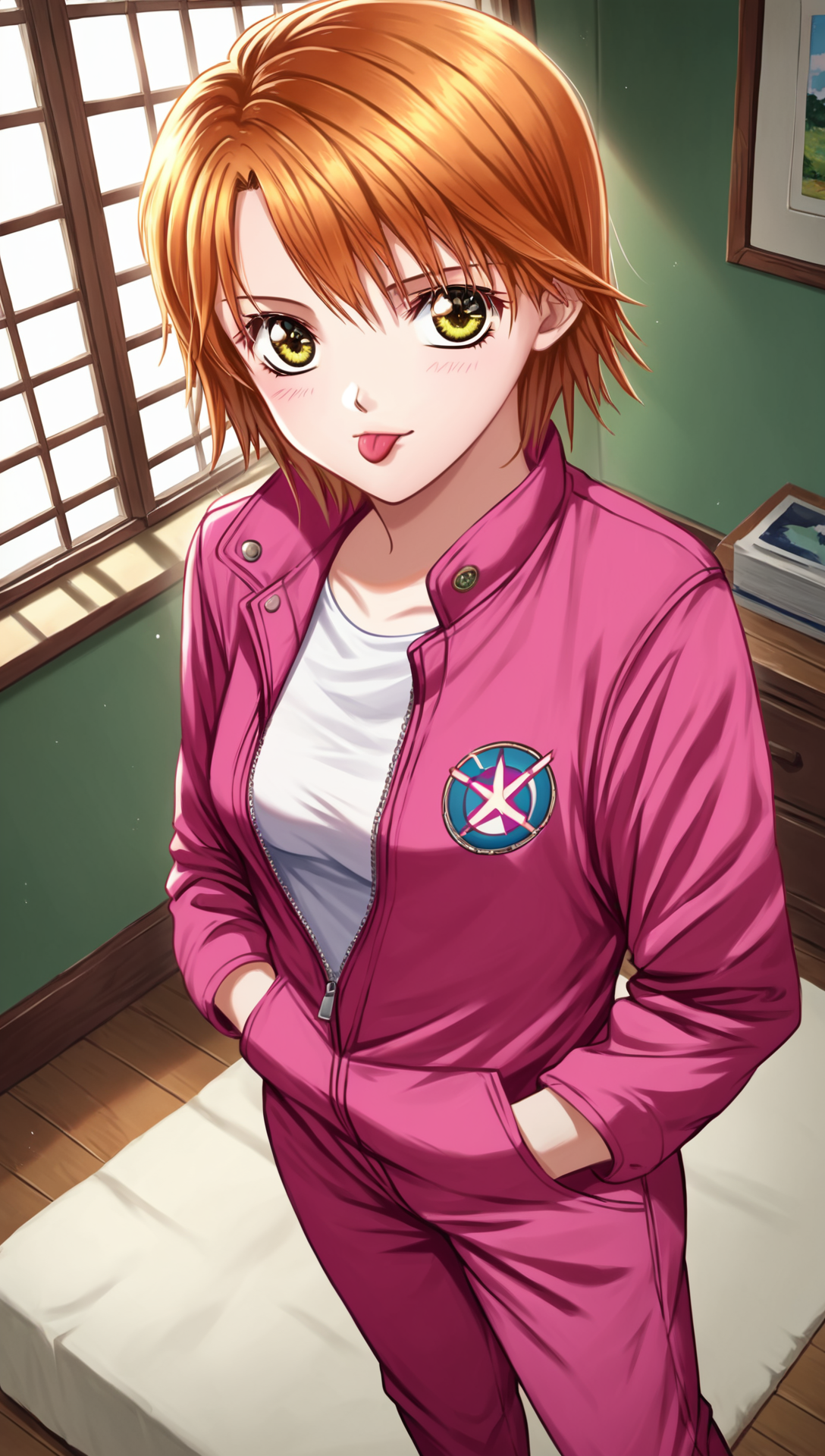 mogami kyoko, pink jumpsuit, || white button-up shirt, short sleeves, blue_and_green_bow, blue_and_green_skirt, plaid bow, plaid skirt, black kneehighs,