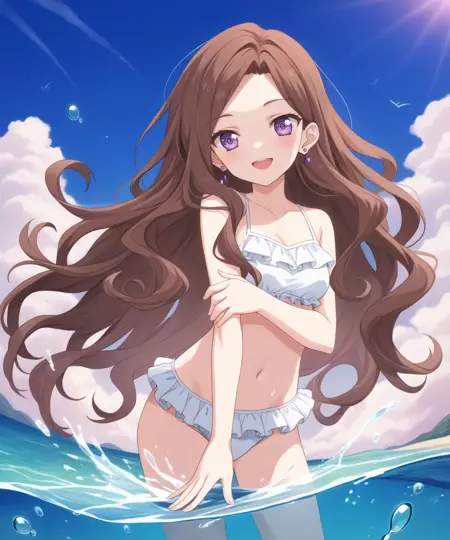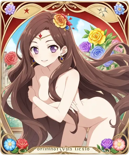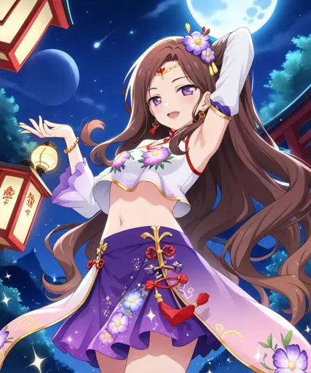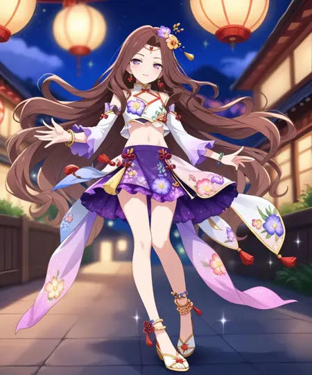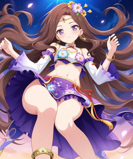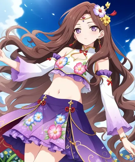anYozora, 보라색 눈, 매우 긴 머리, 파마 머리, 갈색 머리, 중간 갈라진 앞머리, 양쪽으로 흐르는 머리, 보석, 꽃, 머리 장식, 귀걸이 머리 꽃, 캔자시, 원형 머리 장식, 크롭 탑, 어깨 노출, 복부, 배꼽, 분리형 소매, 플로럴 프린트, 긴 소매, 팔찌, 층층이 된 치마, 보라색 치마, 꽃 발목 장식, 발목 밴드, 펌프스, 굽 높은 신발