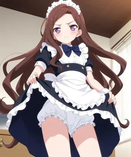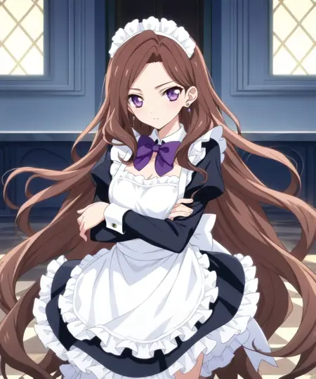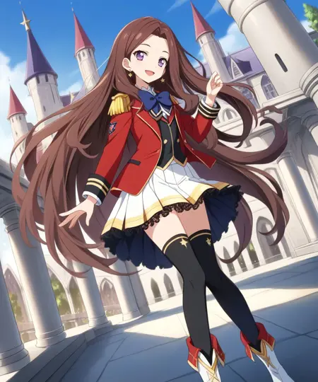 kasumiYOZORA, 보라색 눈, 매우 긴 머리, 파마 머리, 갈색 머리, 중간 갈라진 앞머리, 양쪽으로 흐르는 머리, 귀걸이, 빨간 재킷, 빨간 학교 유니폼, 어깨장식, 파란색 리본넥타이, 금장식, 흰 치마, 층층이 된 치마, 프린지 장식, 레이스 장식 치마, 검은 허벅지 양말, 젯타이 리ョ우키, 흰 신발, 무릎 길이 부츠, 파란 리본