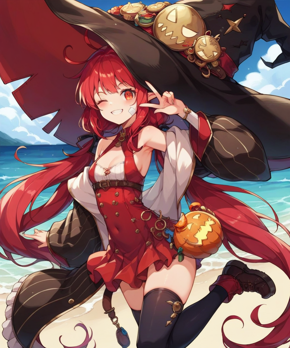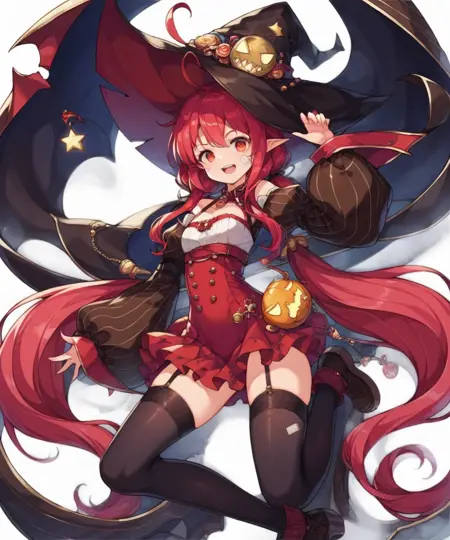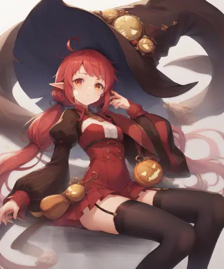 추가 프롬프트(사용이 잘 안 되므로 직접 테스트 필요): candy, cape, dress, full body, sidesaddle, single thighhigh, sleeveless, smile, solo, white background, white shirt, broom riding, Broom, pumpkin, jack-o-lantern, Halloween,