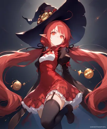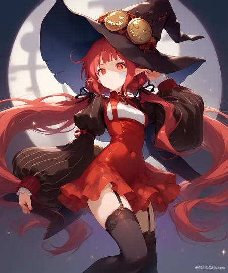 인물: modao, 1girl, solo, ahoge, red hair, sidelocks, bangs, low twintails, red eyes, pointy ears, small_breasts, bandaid on face, hat, witch hat, black thighhighs, thighhighs, witch, puffy sleeves, long sleeves, skirt, red skirt, black thighhighs, jewelry, garter straps,