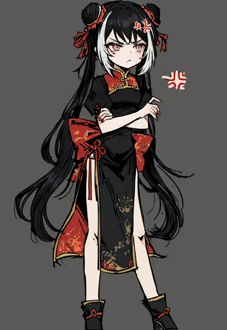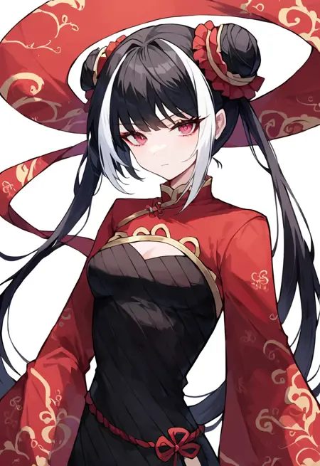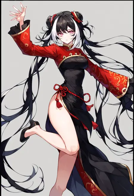 long hair, twintails, multicolored hair, black hair, white hair, double bun, pink eyes