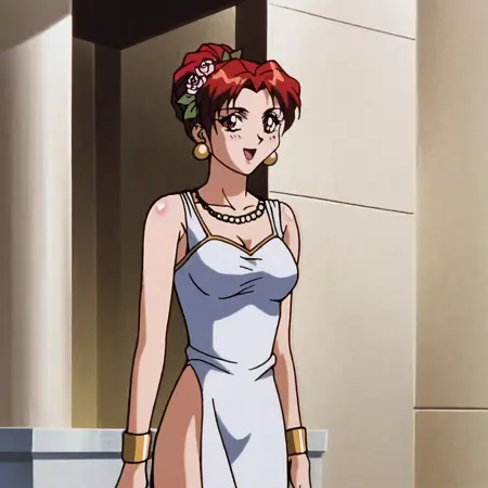 带发髻的触发词:Mai94MovieWeddingOutfit, 1 girl, 单人, 饰品, 耳环, 1girl, 棕色眼睛, 头花, 1990年代(风格),发饰, 复古风格, 红发, 连衣裙, 牛仔镜头