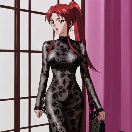 带中式服装的触发词:Mai94MovieChineseOutfit, 1girl, 中式服装, 旗袍, 饰品, 耳环, 大乳房, 口红, 妆容, 分离袖子, 红色眼睛, 马尾辫, 长发, 红发, 牛仔镜头