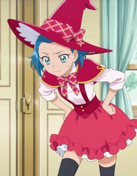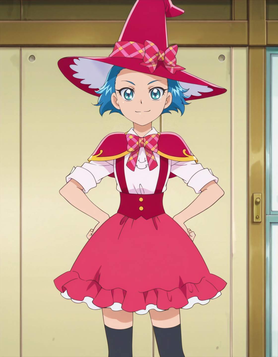 score_9, score_8_up, score_7_up, 动画截图, 单人, 1女孩, 蓝眼睛, 蓝发, 短发, 微笑, 单人, 连裤袜, 校服, 裙子, 校服, 黑色过膝袜, 蝴蝶结, 红色吊带裙, 女巫帽lora:jun:0.8