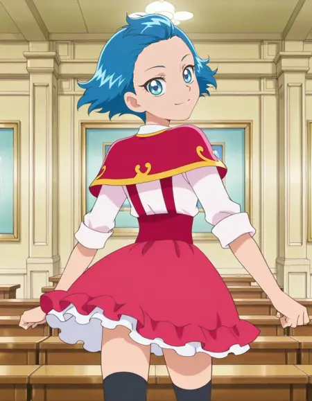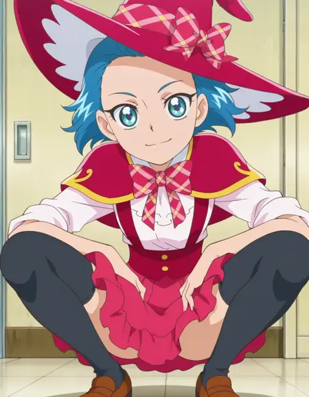 score_9, score_8_up, score_7_up, anime screencap, solo,1girl, blue eyes, blue hair, short hair, smile, solo,pantyhose, school uniform, skirt, school uniform,black thighhighs, bow, red suspender skirt, witch hatlora:jun:0.8