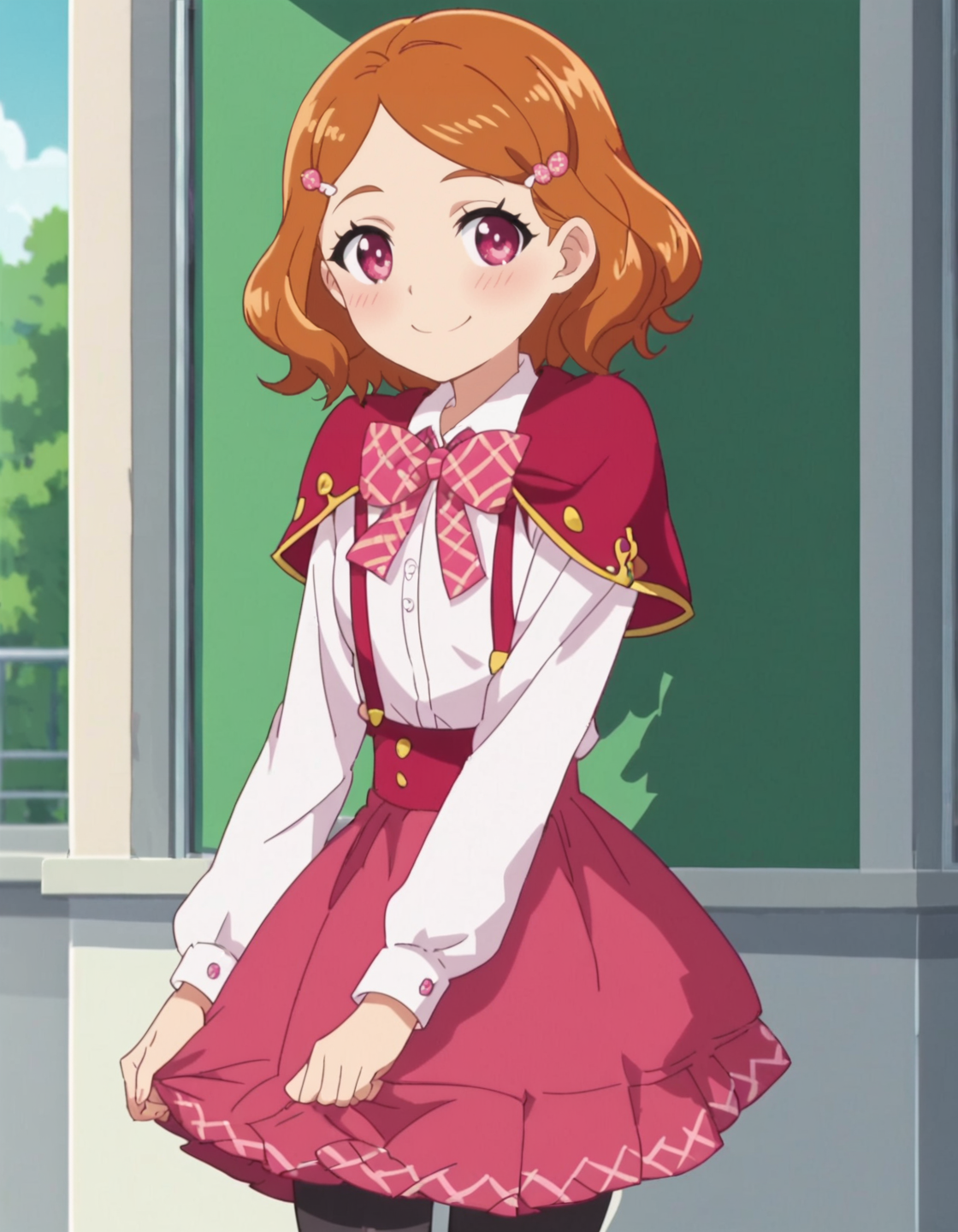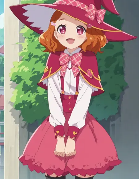 parameters score_9, score_8_up, score_7_up, anime screencap, solo,1girl, pink eyes, brown hair, white hair ornament, solo,school uniform,pink skirt, white shirt,school uniform,black thighhighs, bow, red suspender skirt, witch hat,lora:kay:0.8