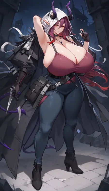 提示词:ascalon \(arknights\),紫色头发,帽子,尾巴,尖耳朵,角,手套,眼睛之间的头发,看着观众,长发,白色夹克,无袖,