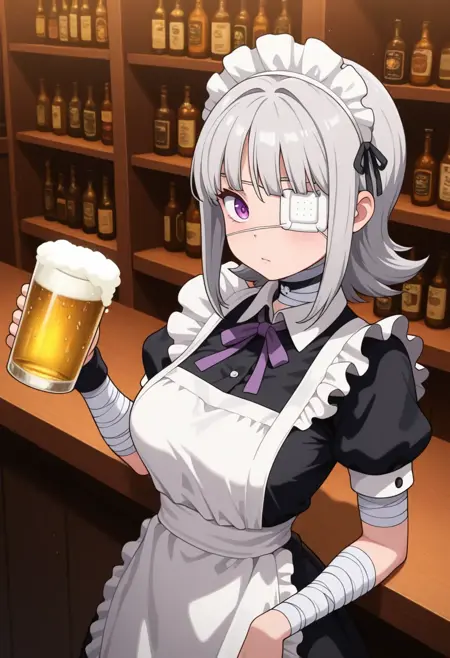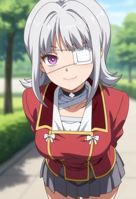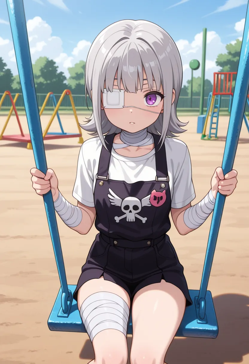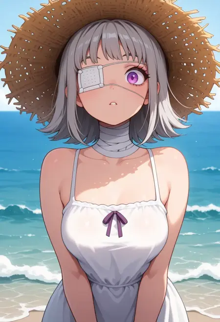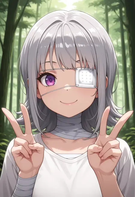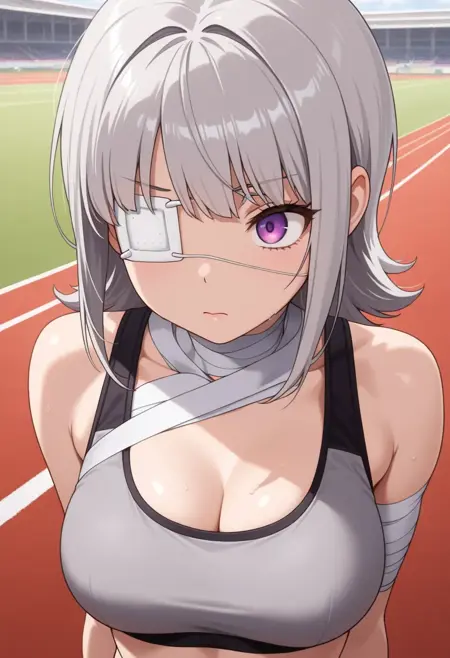 Monroe、アイパッチ、包帯、灰色の髪、紫の目、包帯を巻いた首、医療用アイパッチ、