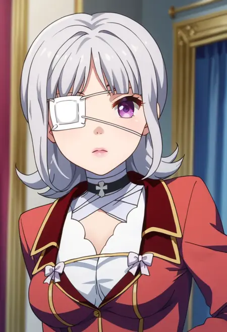 Monroe, eyepatch, bandages, grey hair, purple eyes, bandaged neck, medical eyepatch,