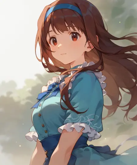 프롬프트:score_9,score_8_up,score_7_up,source_anime,zPDXL3,lora:琴叶p:1,1girl,bangs,brown eyes,brown hair,long hair,solo,blue hairband,medium breasts,