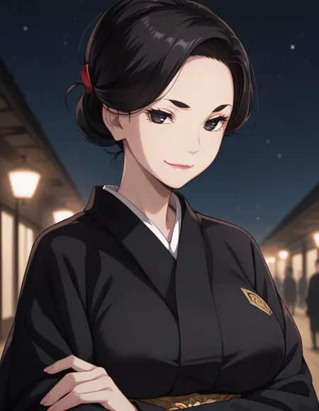 nagami misuzu, mature female, black hair, short hair, single hair bun, forehead, black eyes, lips