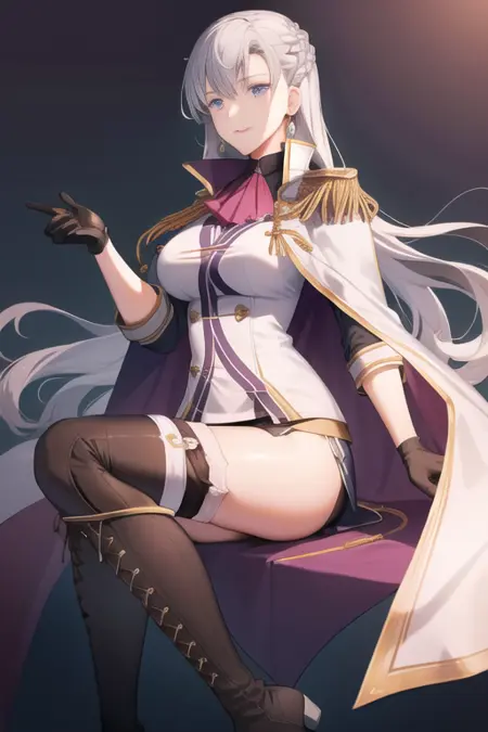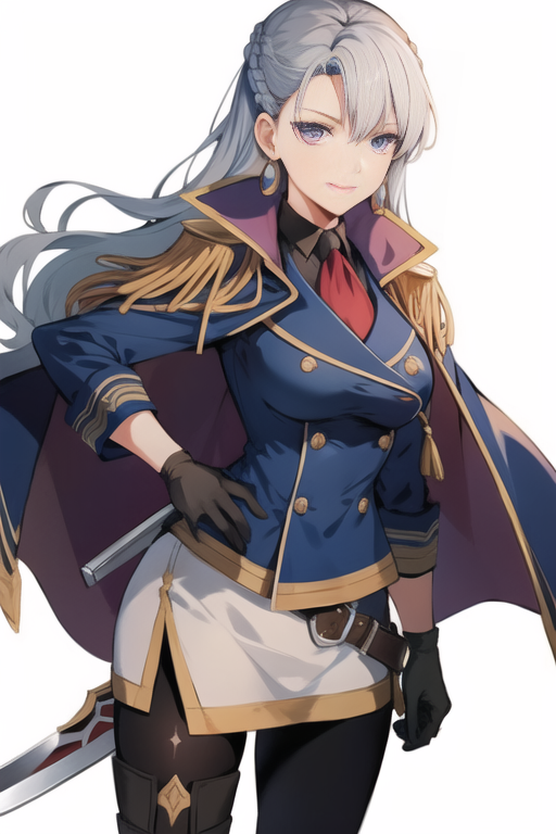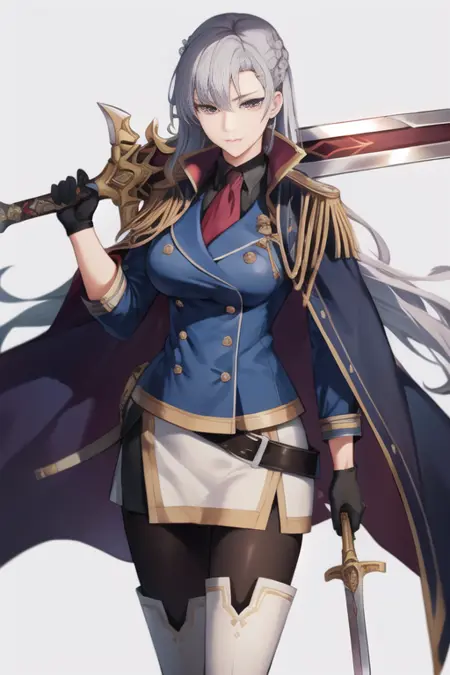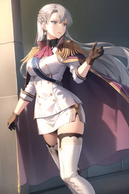 aureliawhite, 1girl, solo, long hair, white uniform, military, white skirt, epaulettes, cape, black gloves, jewelry, earrings, crown braid, french braid, thigh boots, brown boots, thighhighs, pantyhose, ascot, large breasts,