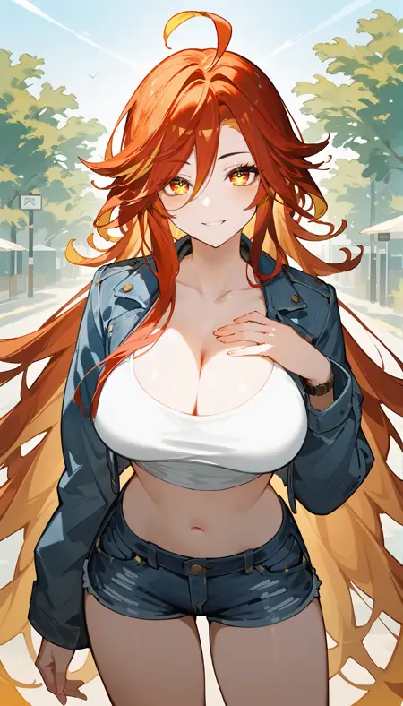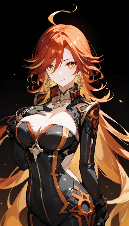 트리거 단어: mavuika, 빨간 머리, 다채로운 머리카락, 노랑 끝, 그라디언트 머리카락, 매우 긴 머리카락, 스윕 앞머리, ahoge, 주황색 눈, 태양 모양의 동공, 기호 모양의 동공