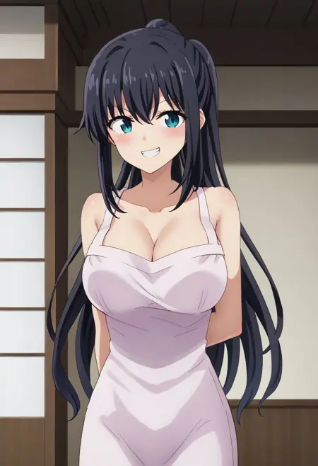 1girl, solo, natsu_no_hyoui_kaho, 黑发, 长发, 马尾, 乳房, 深沟, 大乳房, 白色连衣裙,