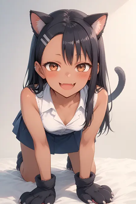 - animal ears, cat ears, tail, animal hands, fake animal ears, cat tail, gloves, paw gloves, kemonomimi mode, skirt, bangs, cat paws, fang, cat girl