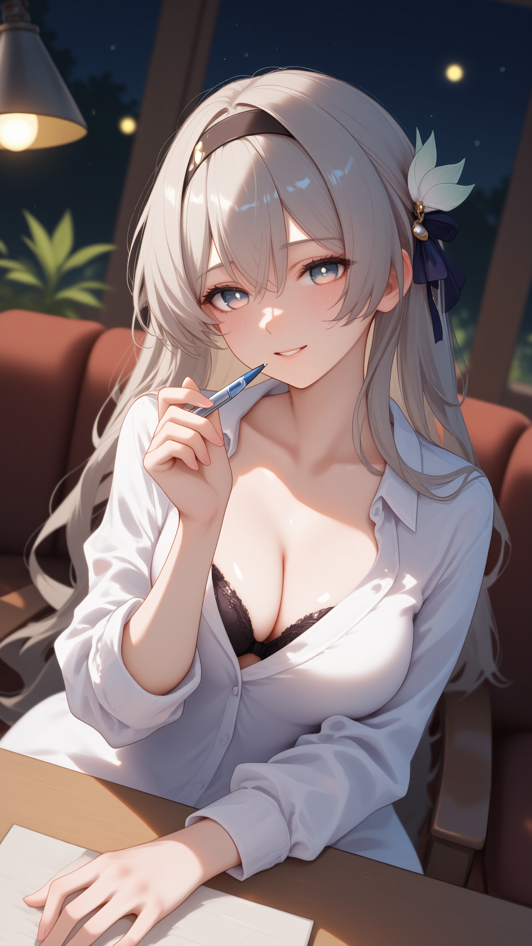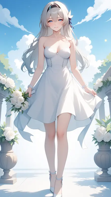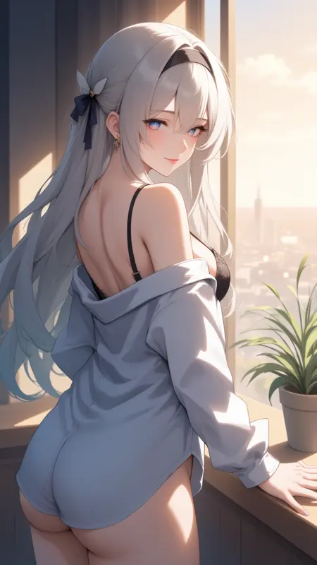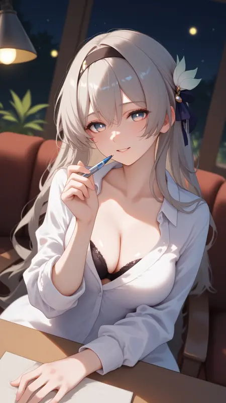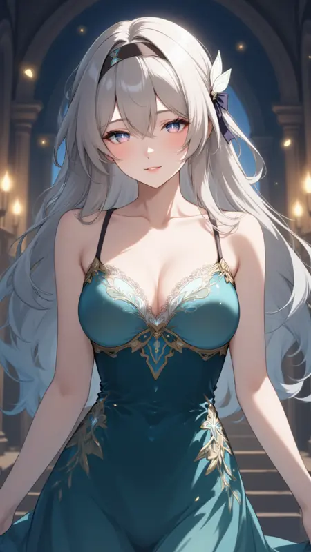 firefly_tj,silver hair,hair ornament,black hairband,long hair,