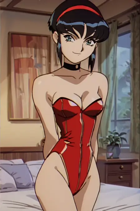Outfit 5: kumashiro sakuya, red hairband, red dominatrix outfit, breastless clothes, frilly clothing, choker, gloves, small breasts, nipples, pussy, no panties, pubic hair, whip