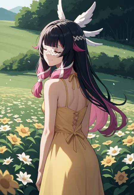 트리거 + 외모: c0lumbina, 긴 머리, 줄무늬 머리, 검은 머리, 분홍 머리, 둔한 앞머리, 머리 리본, 흰 리본, 머리 날개, 눈 감음