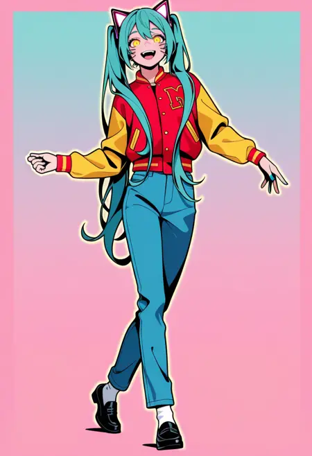 | トレーニングワード | suit, formal clothes, pinstripe pattern, white hat, white jacket, white pants, blue shirt, white necktie, suspenders, black shoes,コピーしました! leather jacket, red jacket, red pants, black shoes,コピーしました! furry, cat, whiskers, black fur, yellow eyes, slit pupils, fangs, claws,コピーしました! red letterman jacket, yellow sleeves, blue jeans, black shoes,コピーしました! |