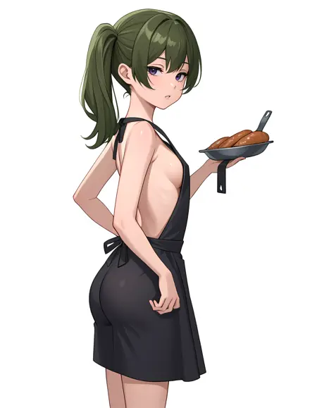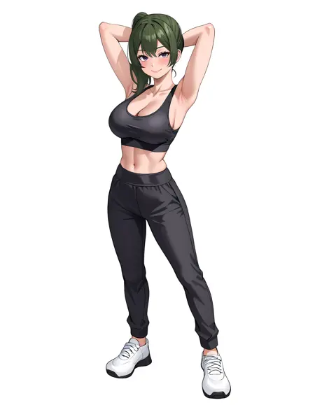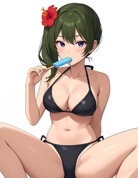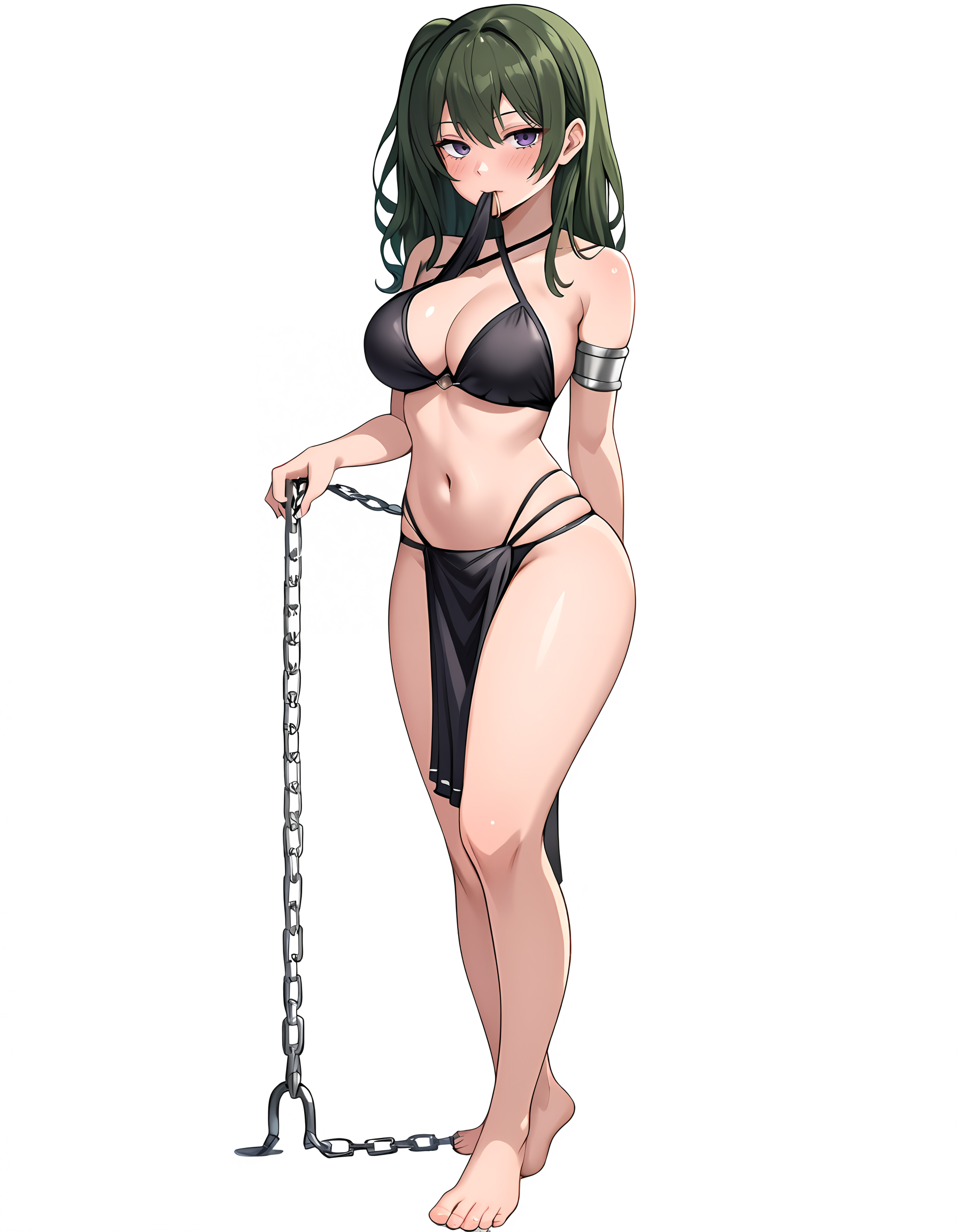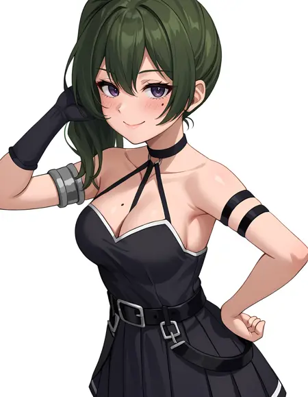 기본 복장: 검은 드레스, 팔 스트랩, 검은 벨트, 허벅지 스트랩, 가슴의 mole, 주름진 드레스, 소매 없는 드레스