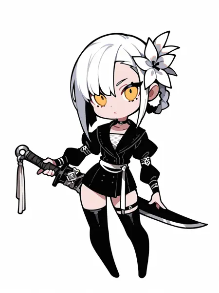 1girl, solo, kaine (nier), 흰색 머리카락, 머리카락에 꽃, 노란 눈, 머리카락 고리