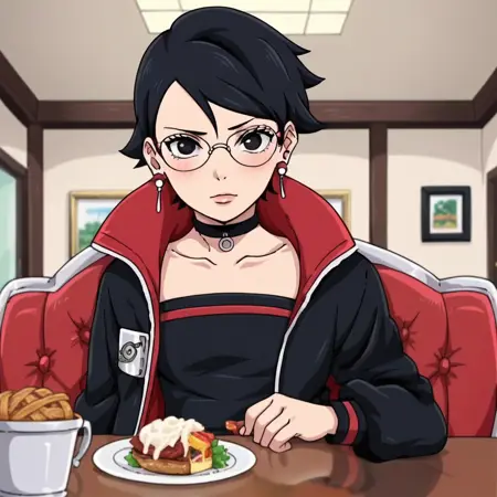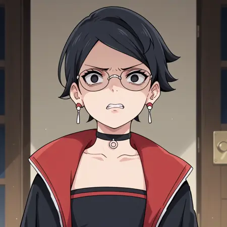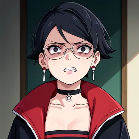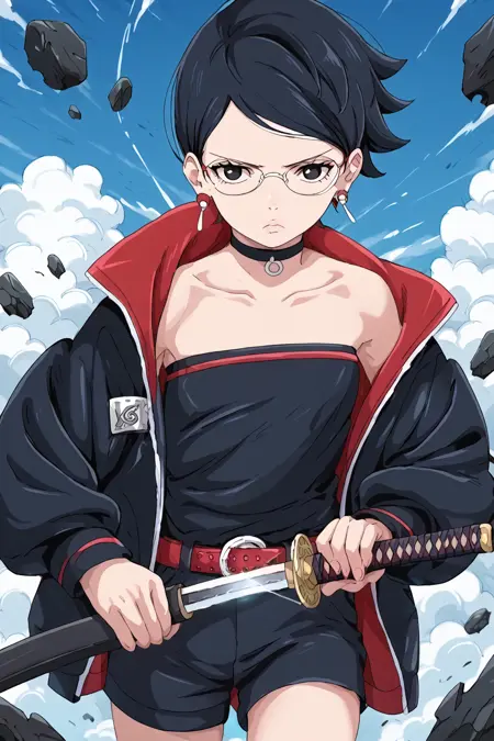 Sarada Uchiha、黒髪、短髪、黒目、眼鏡、イヤリング、チョーカー、開いたジャケット、木葉隠れのシンボル、ストラップレス、赤いベルト、黒いショートパンツ、ハルスター、ハイヒールブーツ