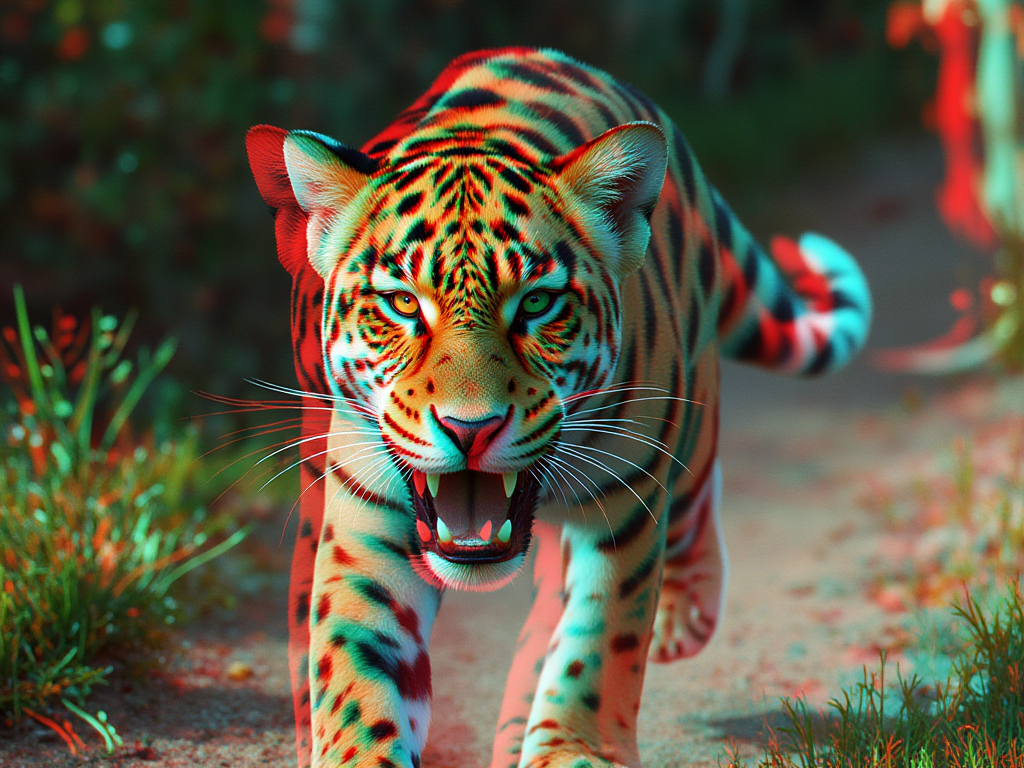 'three_dee a photo of a jaguar leaping towards the camera. 3D Anaglyph'