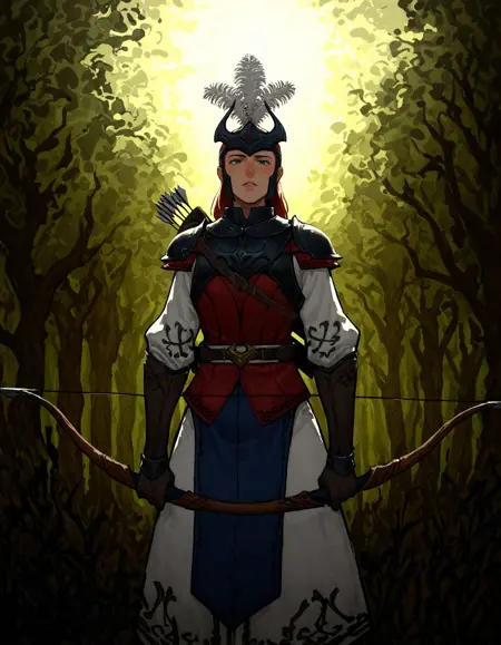 HighElfArcher, pointy ears, armor, hat feather,