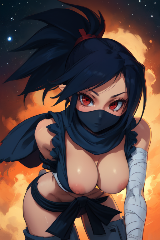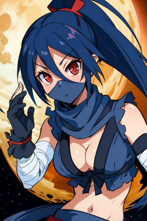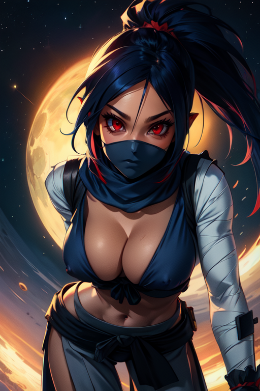 kunoichi, red eyes, ponytail, dark blue hair, pointy ears,