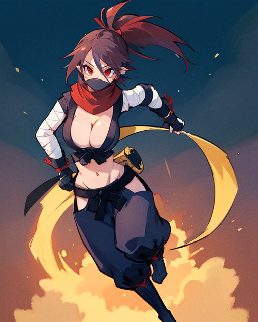 bandages, red scarf, cleavage, midriff, gloves, Ninja Pants with hip vents, red hair ribbon, boots,